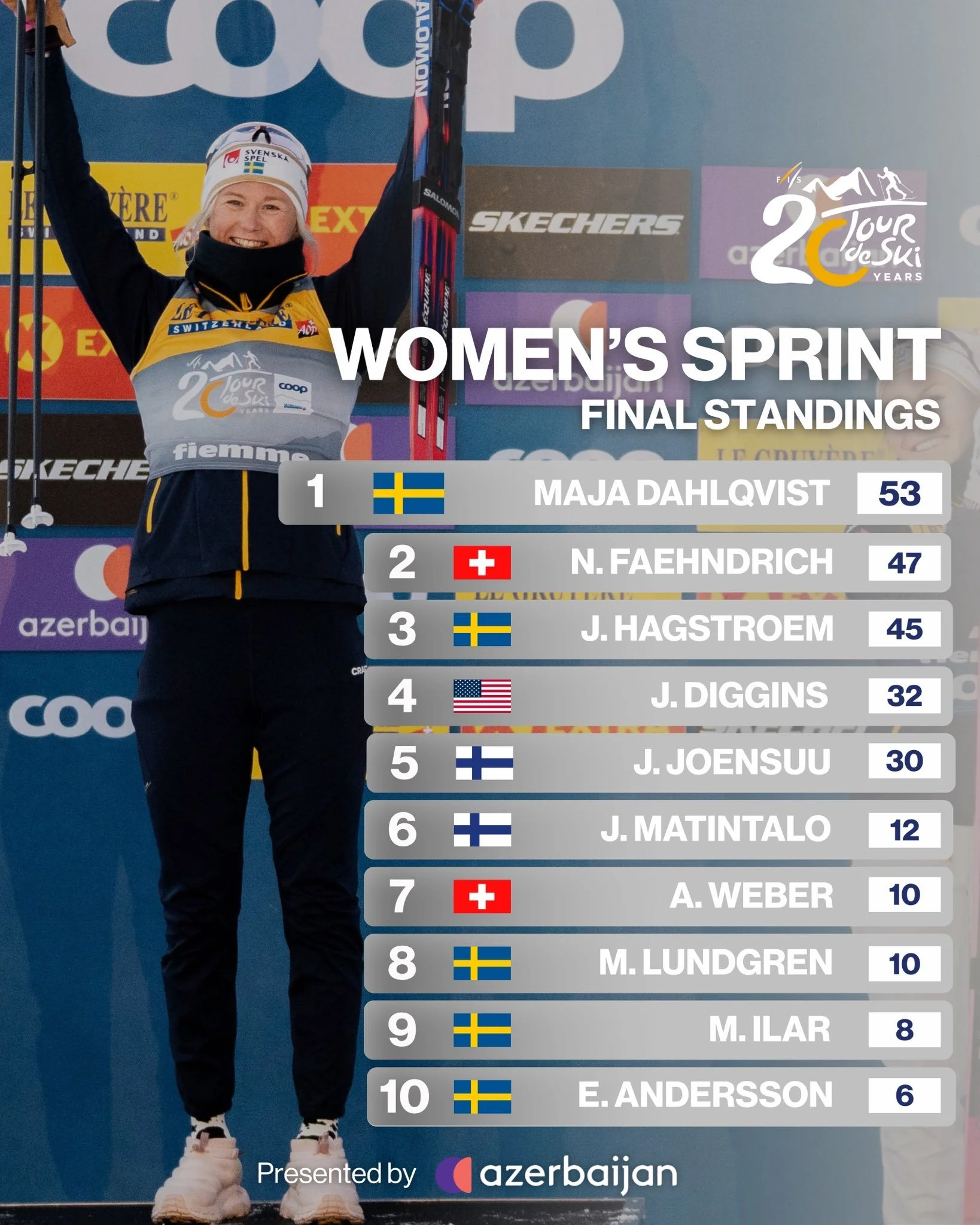 Stage 5 already hinted at what was coming. In the classic sprint, Jasmi Joensuu dominated from the qualification heat all the way to the final to secure her first World Cup victory, while Johannes Høsflot Klæbo delivered a controlled masterclass in the men’s race, finishing three seconds clear of the field. Behind him, Sweden celebrated again as Anton Grahn skied a breakthrough race to his first World Cup podium.