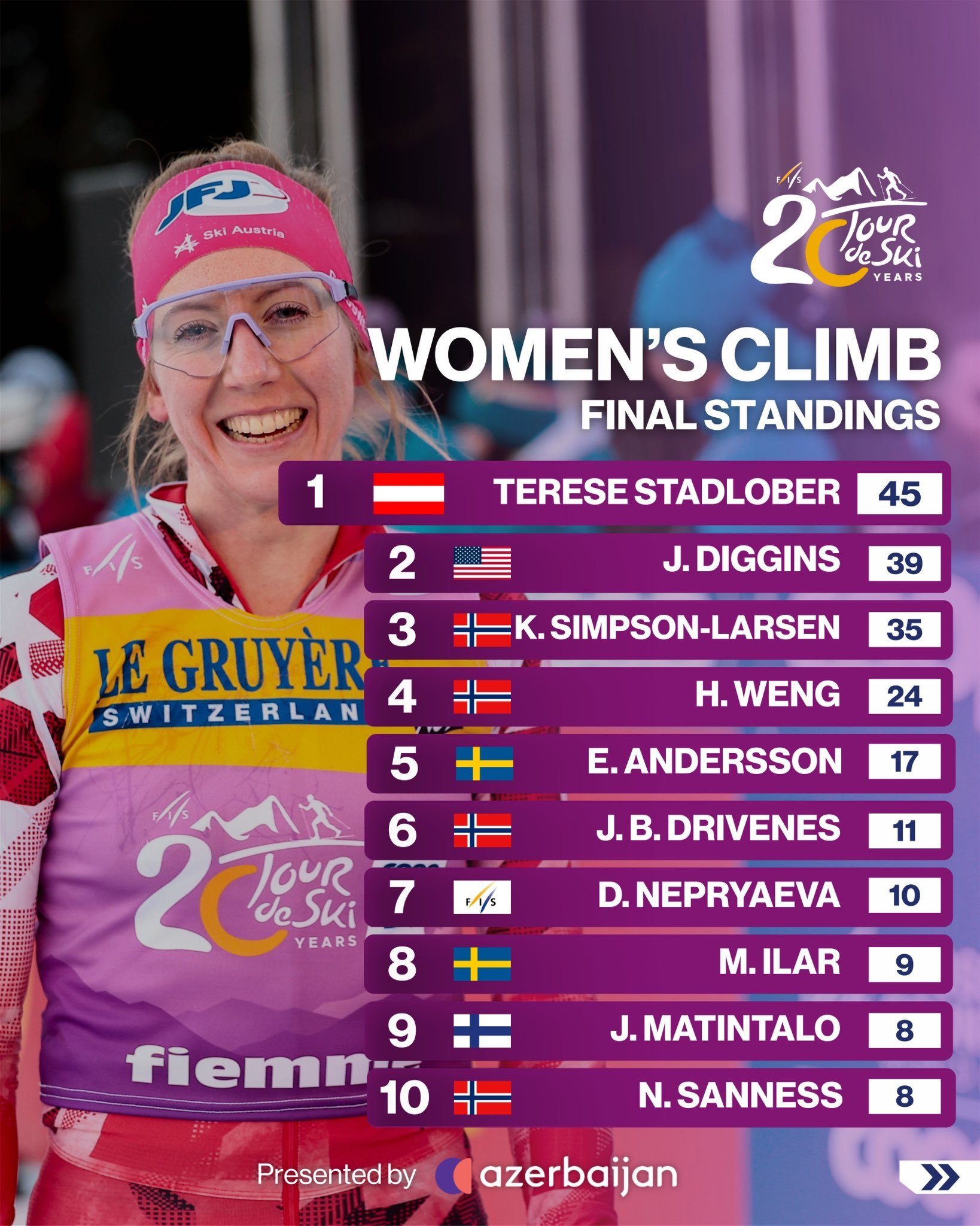 The final stage up the legendary Alpe Cermis turned the Tour into pure endurance. Mattis Stenshagen attacked the mountain to win and also claimed the best climber honors. While Karoline Simpson Larsen proved even stronger than expected, powering to her second World Cup victory in a performance built perfectly for the steepest slopes of the season.