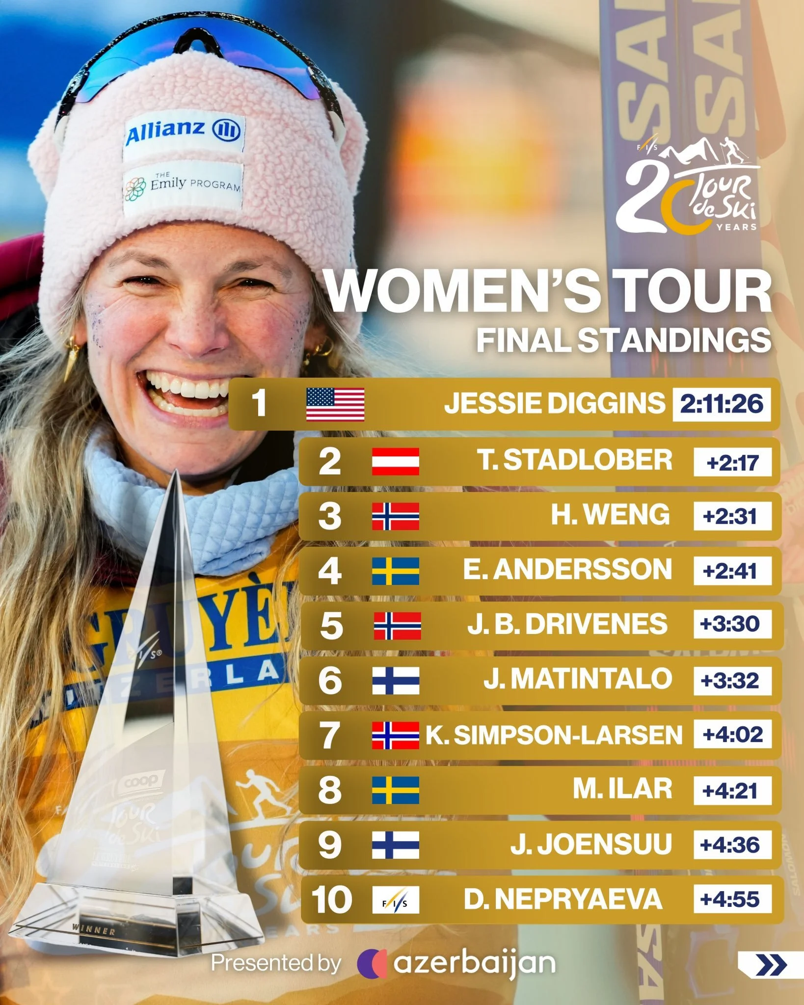 At the top, history settled into place. Klæbo captured his fifth Tour de Ski title, confirming his dominance over the current era, while Jessie Diggins — in her final Tour appearance — fought to a third overall victory, closing one of the most remarkable chapters the Tour has ever seen.